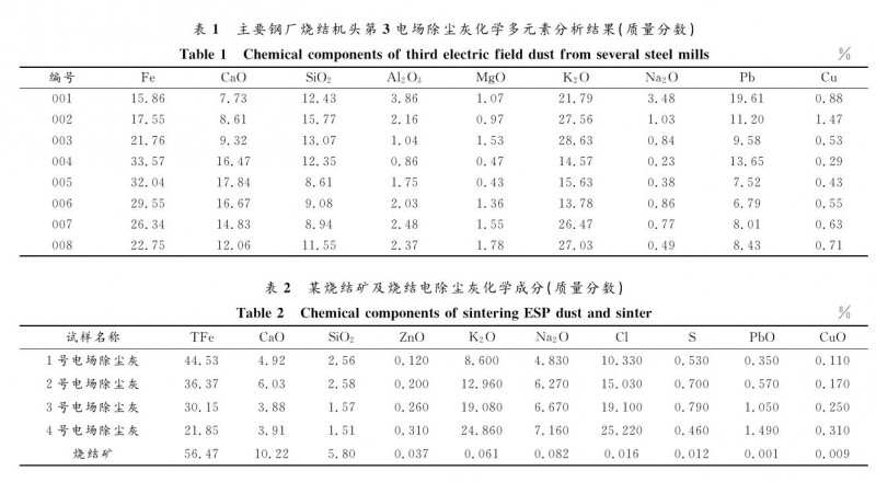 (1)燒結(jié)機(jī)頭除塵灰產(chǎn)生量大、粒度細(xì),成分中含有大量的鐵氧化物可以回收利用,但也含有過(guò)多的以氯化物、氧化物的形式存在的堿金屬、重金屬等,同時(shí)還含有一定量強(qiáng)毒性的二噁英。
