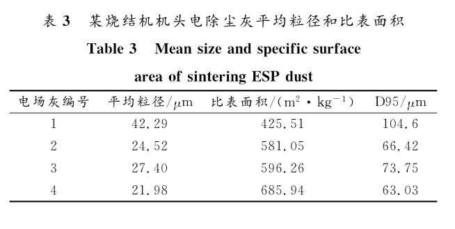 某燒結(jié)機(jī)機(jī)頭電除塵灰的粒度情況見(jiàn)表3 ??梢钥闯觯瑹Y(jié)機(jī)機(jī)頭電除塵灰隨電場(chǎng)由前到后(1號(hào)→2號(hào) →3號(hào)→4號(hào))粒度逐漸變細(xì),比表面積升高。付本全等[10]的測(cè)試表明:前端電場(chǎng)的大粒度粉塵呈塊狀、粒狀,后端電場(chǎng)的小粒度粉塵呈簇狀、團(tuán)絮狀,干法 磁選后1號(hào)電場(chǎng)磁性物質(zhì)比例較大,達(dá)48.94% ,2號(hào)、3號(hào)電場(chǎng)除塵灰的磁性物質(zhì)比例較低,主要受除塵灰顆粒表面包裹的一層非磁性物質(zhì)影響。