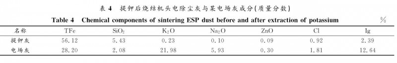 由于鉀在燒結(jié)機(jī)頭電除塵灰中主要以氯化物的形態(tài)存在,針對(duì)其易溶于水的特點(diǎn),其提取利用主要研究方向?yàn)橹苽渎然涀鳛榉柿稀埫返?sup>[20]在國(guó)內(nèi)現(xiàn)有除塵灰提取氯化鉀的工藝基礎(chǔ)上提出了水洗脫鉀 → 固液分離 → 除雜與脫色 → 固液分離 → 真空蒸發(fā) → 冷卻結(jié)晶的氯化鉀回收新工藝,獲得氯化鉀質(zhì)量分?jǐn)?shù)達(dá)97.24%的產(chǎn)品。錢峰等[21] 采用水浸、磁選、過(guò)濾、蒸發(fā)等工藝,去除其中的有害元素,開(kāi)發(fā)出二次提純結(jié)晶的方法,將氯化鉀質(zhì)量分?jǐn)?shù)由93.0%提高到99.8% ,磁選濾渣不僅堿金屬含量降低,而且鉛含量也大幅降低。郭占成等[22]發(fā)明了一種利用燒結(jié)電除塵灰生產(chǎn)氯化鉀的方法,并在唐山市曹妃甸區(qū)建立了一條利用冶金富鉀粉塵年產(chǎn)氯化鉀5萬(wàn)t、年產(chǎn)精鐵粉20萬(wàn)t的生產(chǎn)線,實(shí)現(xiàn)了燒結(jié)電除塵工業(yè)化再循環(huán)利用[23],其處理后的某批次除塵灰與作為原料的某燒結(jié)機(jī)電場(chǎng)灰的主要成分情況見(jiàn)表4 ??梢钥闯?,提鉀后的除塵灰精粉鉀、鈉含量均大幅降低,鐵品位得到大幅提升。但是由于這種工藝所用原料來(lái)自各個(gè)鋼廠,所回收的鐵精粉成分及燒結(jié)性能不固定,對(duì)其利用可能會(huì)造成一定障礙。