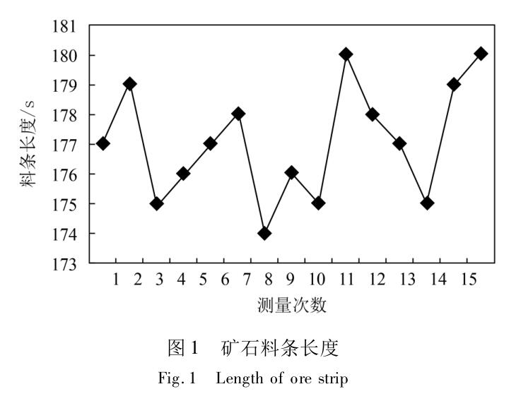 針對上述改造方案,對我廠 B 高爐逐步進(jìn)行改造,首先調(diào)整燒結(jié)礦排料間隔時(shí)間,現(xiàn)場將 2A -10A 共9 個(gè)倉縮短2 s 時(shí)間,現(xiàn)場測試料條效果較明顯。實(shí)測現(xiàn)場礦石物料基本頭尾相接無明顯空擋,但在連接處仍有窄料條。隨即將時(shí)間再次調(diào)整 1 s,測試現(xiàn)場物料基本按要求重疊且料條寬度基本一致,已達(dá)到預(yù)期效果。焦炭倉將現(xiàn)場閘門開度調(diào)整到最大后,將 8B - 2B 共 7 個(gè)倉間隔時(shí)間縮小 3 s,并記錄 15 批時(shí)間。實(shí)側(cè)平均料條長度為 14. 1 s,礦石長度為 136. 4 s,詳見圖 3、圖 4。