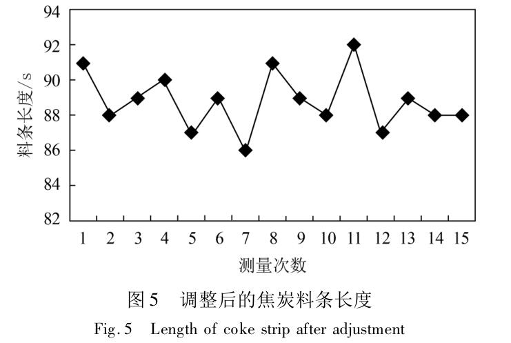 焦炭在第一次調(diào)整后皮帶物料基本頭尾相接,料寬基本一致;但焦炭在皮帶上料層厚度仍有調(diào)整余地,按預(yù)定方案將焦炭分料種平鋪。經(jīng)過第二次調(diào)整后測試15 批物料,實(shí)測料條長度降為88. 4s,效果顯著,如圖 5 所示。
