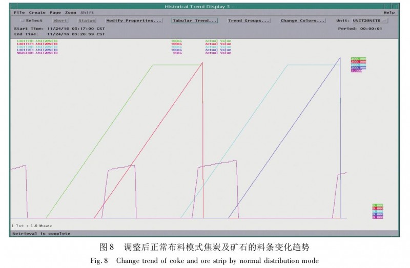 調(diào)整后因高爐爐況波動(dòng)曾出現(xiàn) 1 次較大的塌料,其中最深尺料線達(dá) 4. 3 m。按調(diào)整前上料能力需近2 h 可恢復(fù)料線,實(shí)際僅經(jīng)1 h 15 min 即達(dá)到設(shè)定料線。同時(shí),2016 年 11 月開始測試分割布料,即C /O /O 布料模式(即焦/礦1/礦2 ),此種情況下較前每批上料多 1 批礦石(圖 6 ~ 8)。之前上料能力無法滿足基本上料,在調(diào)整后滿足了生產(chǎn)工藝要求。