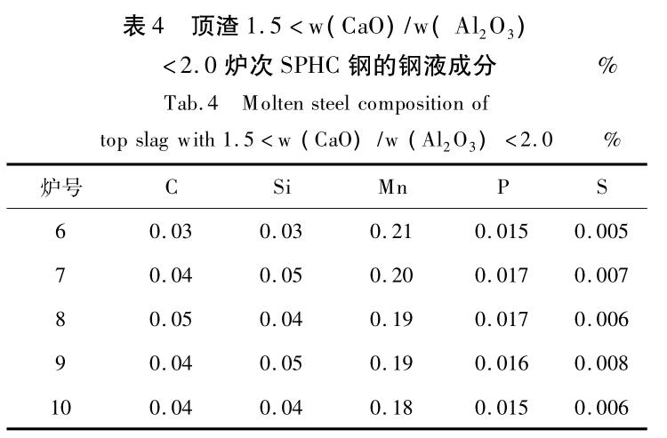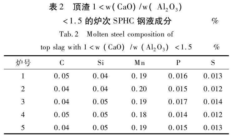 本次試驗(yàn)使用鋼種為 SPHC,試驗(yàn) 15 爐次。將此 15 爐 次 根 據(jù) 精 煉 爐 頂 渣 中 不 同 w ( CaO ) /w( Al2O3) 分為3個(gè)對(duì)比組,主要研究精煉頂渣中不同w( CaO) /w( Al2O3 )對(duì)鋼水可澆性和脫硫效果的影響。SPHC 鋼種成分如表 1 所示。