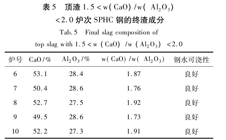 ( 2) LF 頂渣 w( CaO) /w(Al2O3)控制在1.5~2.0,脫硫和鋼水可澆性都能達(dá)到很好的效果。