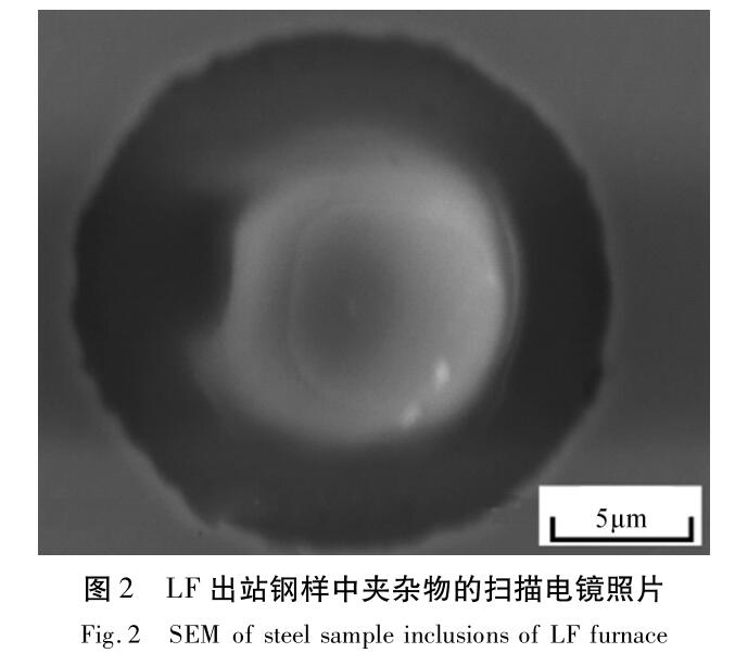 另外,CaO 的活度高,在頂渣中 CaO 可以電離出大量鈣離子。鈣離子擴(kuò)散到鋼液中可以和 MgO·Al2O3 尖晶石反應(yīng)生成低熔點(diǎn)的 CaO·MgO·Al2O3復(fù)合型非金屬化合物。經(jīng)許多冶金工作者發(fā)現(xiàn),要想實(shí)現(xiàn) MgO·Al2O3尖晶轉(zhuǎn)變成低熔點(diǎn)的CaO·MgO·Al2O3復(fù)合型非金屬化合物,只需要很少的鈣離子就可以完成轉(zhuǎn)變。如果鈣離子過多,鈣離子會(huì)把 CaO·MgO·Al2O3中的 MgO 還原,生成 CaO·Al2O3化合物,CaO·Al2O3同樣是高熔點(diǎn)化合物,也會(huì)導(dǎo)致鋼水可澆性差。所以頂渣中的w( CaO) /w(Al2O3) 不宜太高,也不宜太低。經(jīng)試驗(yàn),w( CaO) /w( Al2O3) 控制在1.5~2.0比較合適。如圖 1、圖 2 所示為優(yōu)化后鋼樣中夾雜物的掃描電鏡照片及能譜分析結(jié)果,優(yōu)化后的夾雜物得到了很好變性,尺寸較小、形狀較規(guī),并且是為復(fù)合型夾雜,熔點(diǎn)較低,易于上浮去除。