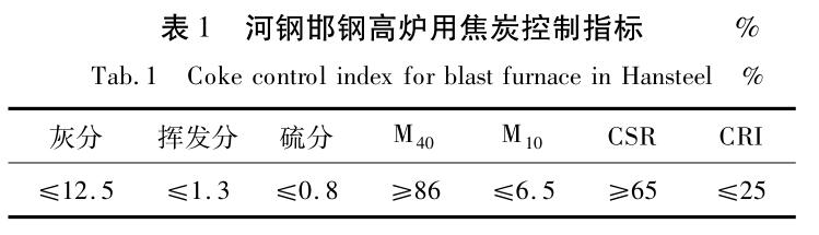 隨著高爐大型化、高冶強(qiáng)操作生產(chǎn)的發(fā)展,對焦炭質(zhì)量要求也越來越高。尤其高爐降焦增煤后,礦焦比升高,焦炭在爐內(nèi)負(fù)荷加重,滯留時間延長,同時由于焦窗面積減小而導(dǎo)致料柱透氣性下降。鐵前技術(shù)人員通過優(yōu)化煉焦炭配煤結(jié)構(gòu),重點推進(jìn)降灰降硫工作,一是大力開發(fā)低灰低硫煤種資源,逐步增加山西區(qū)域優(yōu)質(zhì)焦煤,并適當(dāng)調(diào)配進(jìn)口低灰焦煤; 二是穩(wěn)定低灰低硫 1/3 焦煤比例在 15%,同時停配性價比差的高灰焦煤及高硫氣肥煤,最終將黏結(jié)性和結(jié)焦性較好的焦煤、肥煤比例保持在 65% ~ 70%,在保證焦炭強(qiáng)度的基礎(chǔ)上,控制灰分≤12.5%,硫分≤0. 8%,具體指標(biāo)見表 1。