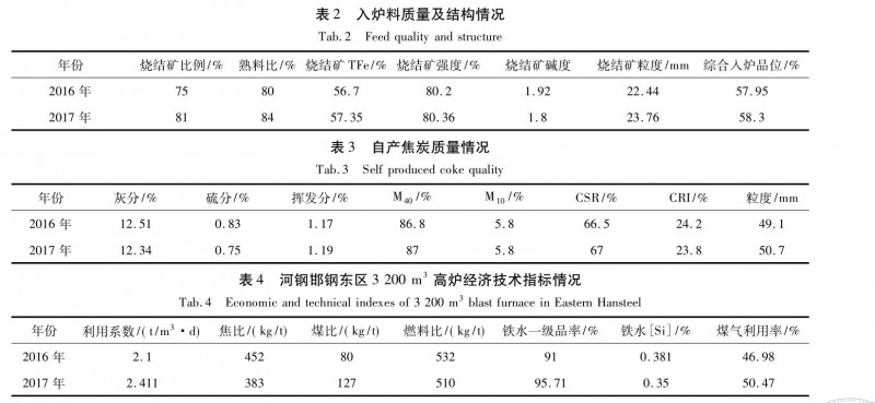 ( 1) 2017 年河鋼邯鋼鐵前系統(tǒng)通過改善入爐原燃料質(zhì)量、優(yōu)化高爐各項操作制度、加強(qiáng)日常外圍管理等措施,在實現(xiàn)爐況穩(wěn)定順行基礎(chǔ)上,經(jīng)濟(jì)指標(biāo)得到大幅改善,其中焦比較 2016 年降低了 69 kg /t,煤比升高了 47 kg /t,燃料比降低了 22 kg /t,實現(xiàn)了降本增效。