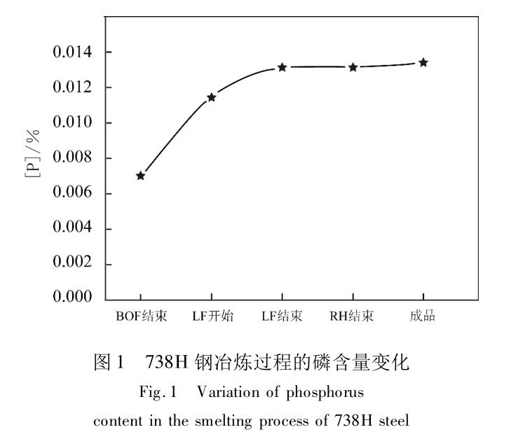 圖 1 為高合金鋼 738H 鋼冶煉時在轉爐出鋼后,整個冶煉過程中的磷含量變化。從圖 1 中看出,磷含量控制較好,滿足對成分磷含量的控制要求。