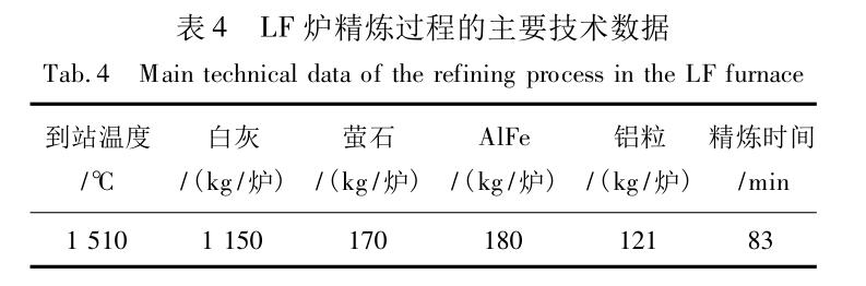LF 爐精煉采用微正壓操作,嚴格控制渣、鋼的氧化性和精煉渣脫硫冶煉工藝。精煉過程采用鋁粒進行渣面脫氧和鋼液脫氧,鋁粒的總加入量為 121kg /爐次;精煉過程的白灰和螢石總耗量為 1 320kg /爐次,LF 爐精煉過程的詳細數(shù)據(jù)如表 4 所示。