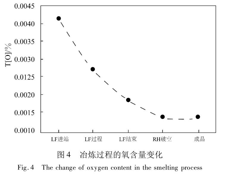 高合金鋼冶煉過程的硫含量控制穩(wěn)定,滿足鋼種冶煉要求,采用 LF 爐精煉脫硫對鋼中硫含量進行控制。在實際生產(chǎn)中,成品鋼的平均硫含量和氧含量為 0. 002%以下。