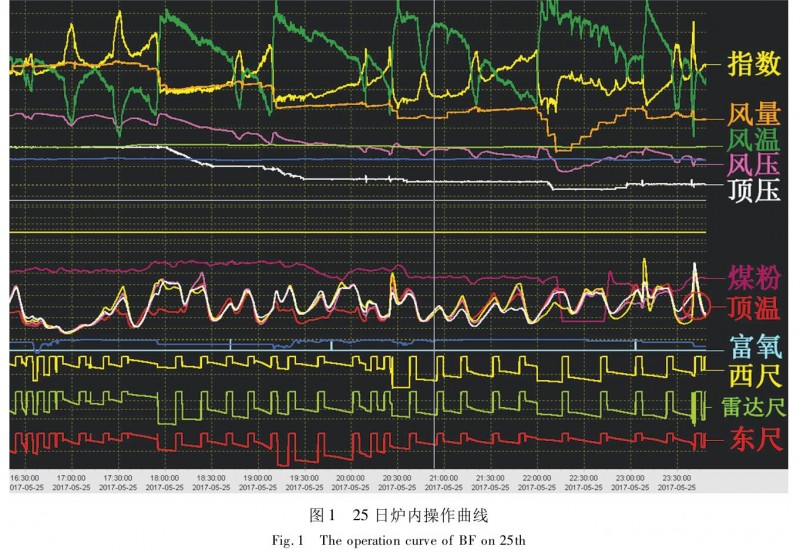 25 日00:25,沖渣系統(tǒng)1-1B 皮帶故障,4#攪籠下料口堵死,高爐 4#出鐵口于 00:26 被迫堵口處理故障,3:30 恢復正常出鐵,對爐內造成一定影響,出現(xiàn)憋風現(xiàn)象。1:00 以后爐內指數(shù)下降,吃風能力變差,于 2:40 停富氧,4:00 出管道,爐溫持續(xù)下行,處于嚴重虧熱狀態(tài)。在此期間,于 19 批加焦炭 1 t/p,負荷退至 5. 36,40 批加焦炭 1 t/p,礦批減 5 t/p,負荷退至 5.05,但為時已晚,冷氣流已形成,煤氣流不穩(wěn),伴隨滑尺、塌料、管道行程,爐內被迫減風、加集中焦等措施來恢復爐況。
