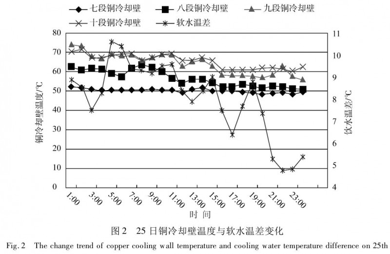 25 日白班接班以后爐溫水平持續(xù)下行到 0.1%以下,物理熱最低 1 409 ℃,大量涼渣鐵聚集于軟熔帶,堵塞焦窗煤氣通道,煤氣向中心滲透困難,邊緣氣流不穩(wěn)定,連續(xù)崩塌料、管道,透氣性指數(shù)劇烈波動,頂溫、頂壓冒尖多(見圖1),爐身靜壓力波動大[2],爐腹及爐腰段銅冷卻壁溫度持續(xù)下行,軟水溫差波動大(見圖2),爐內接受風量困難,煤氣不穩(wěn)定、煤氣利用率低,造成爐溫進一步下滑。
