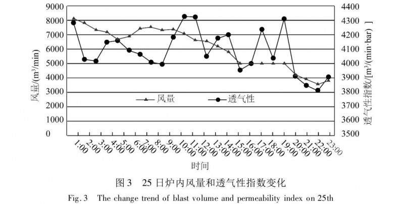 25 日爐溫持續(xù)下行,出現(xiàn)冷氣流現(xiàn)象,爐內適當減小風量,風溫從 1 140 ℃逐步提高到 1 200 ℃,冷氣流無法消除;于 11:20 停止富氧,第 40 批扒 5 t礦批,加入 1 t/p 焦炭,負荷由 5.36 退到 5.05,但效果不明顯,期間料尺工作差,多次出管道,透氣性指數(shù)上下劇烈波動。到 25 日 13: 00 風量減到 6 500m3 /min(圖 3),仍然無法穩(wěn)定住氣流,煤氣利用率由平均 49% 下降到 46%,爐溫[Si]= 0.03%,[S]=0.2%。爐內嚴重虧熱,渣鐵粘稠,爐外出渣鐵困難,爐渣從渣溝兩側溢出,鐵口出鐵過程中被涼渣自動糊死。爐前工用河沙加高渣溝兩側,防止爐渣溢出,并縮短出鐵間隔,及時把爐內涼渣鐵排出。為了改善渣鐵流動性,于 49 批加螢石 1 t/p,同時于 59批扒 16 t/p 礦,負荷退到 4.56,進一步穩(wěn)定煤氣。但輕負荷料未下達爐缸前,爐內冷氣流無法消除,爐溫仍無回頭趨勢,被迫減風控制煤氣流,至 22:00 風量已減至 3 800 m3 /min[3]。