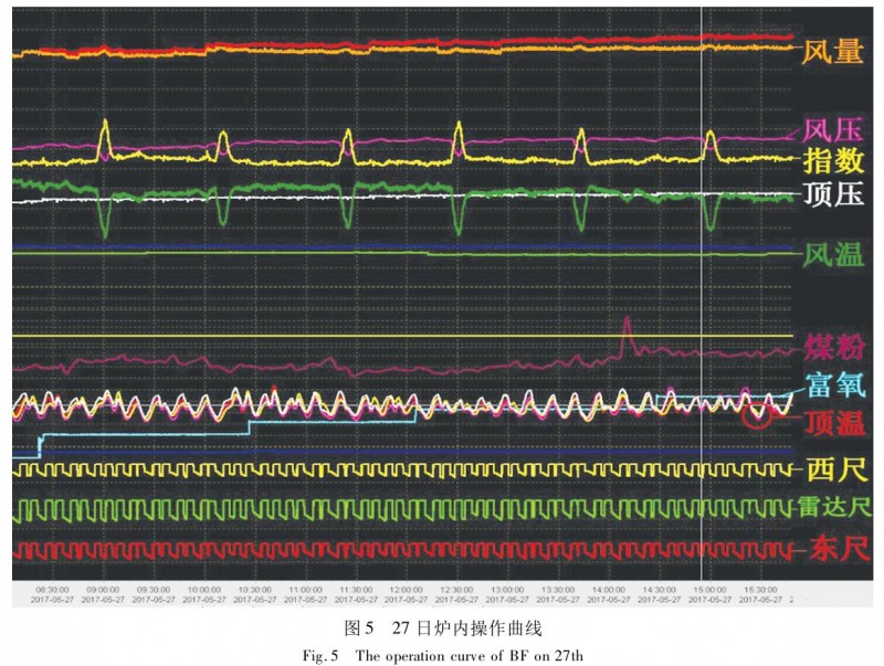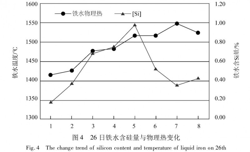 26 日發(fā)現(xiàn)退負荷效果不明顯,爐內氣流仍無法控制,管道、塌料頻繁,料尺工作差,爐溫低,開始加集中焦處理爐況。分別于第 5 批料附加 2 批焦炭,第 10 批開始每隔 5 批附加 1 整批焦炭,實際焦炭負荷 3. 8,隨著附加焦的逐步作用,爐內關系明顯見好,管道、塌料現(xiàn)象減少,料尺工作好轉,爐溫逐漸上行,爐缸工作狀態(tài)好轉。爐內開始向上逐步平衡風量,至 26 日 23:00,風量已平衡到 6 900 m3 /min,透氣性指數(shù) 4 000,風溫1 000 ℃,爐溫0.42%,鐵水物理熱 1 524 ℃(圖 4),爐內冷氣流基本已消除,軟熔帶煤氣分布恢復正常,爐缸熱制度達到正常水平。于27 日38 批開始取消附加焦,每批焦炭從 32. 9 t/p增加到35.9 t/p,負荷為 4.16;60 批焦炭從 35. 9 t/p降到34.9 t/p,礦批150 t/p 增至155 t/p,負荷 4.56,爐內關系平穩(wěn),料尺工作好;至27日13: 00,風量8200 m3 /min,透氣性指數(shù)4 190,富氧率 2%,風溫1 135 ℃,爐內關系平穩(wěn),爐況基本恢復正常,操作參數(shù)見圖 5。