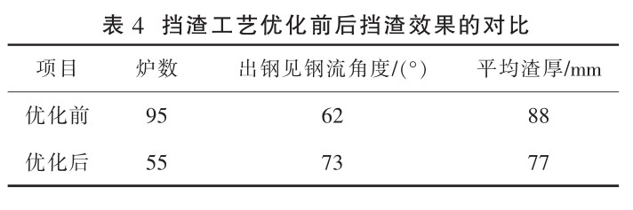 擋渣工藝優(yōu)化后, 減少了出鋼初期進入鋼包內(nèi)部的爐渣,并減少了出鋼末期的帶渣量。 擋渣工藝優(yōu)化前后擋渣效果的對比見表 4 所示。 由表 4看出,出鋼見鋼流角度由 62° 提高至 73° ,爐渣平均厚度由 88 mm 降低至 77 mm 。
