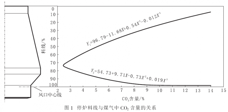 高爐降料線期間, 高爐風(fēng)量不大于正常風(fēng)量的85%,嚴(yán)格控制爐頂溫度,及時(shí)調(diào)節(jié)水量。爐頂溫度控制≤300 ℃, 齒輪箱溫度≤80 ℃, 閥箱溫度≤120 ℃, 爐頂壓力≤0.10 MPa, 煤氣中H2含量≤12%,O2含量≤2%, 停爐料線與煤氣中CO2含量的關(guān)系如圖1 所示。由圖1 可以看出,隨料線下降煤氣中CO2含量降低, 料線降至爐腰處時(shí)降至最低,隨著料線繼續(xù)下降,煤氣中CO2含量反而升高。