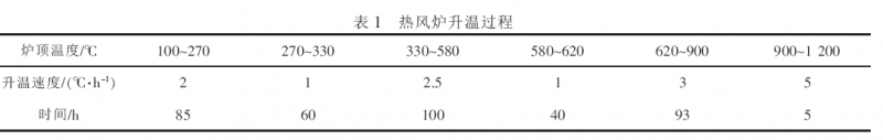 由于7 號(hào)高爐熱風(fēng)爐使用年限已久, 建筑設(shè)備老化, 腐蝕部位較多, 停爐后自然涼爐時(shí)間較長,且7 號(hào)高爐熱風(fēng)爐燃燒室上部、拱頂和蓄熱室上部及拱頂總體均為硅磚結(jié)構(gòu), 所以本次熱風(fēng)爐烘爐以安全為第一要素,采取循序漸進(jìn)的方式,制定了熱風(fēng)爐烘爐規(guī)程[1]。熱風(fēng)爐升溫過程見表1。