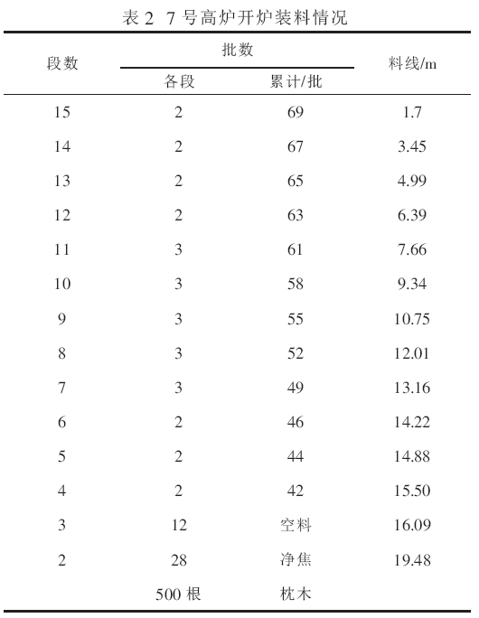 此次開爐由于停爐時(shí)間長,天氣寒冷,恢復(fù)難度較大, 且7 號(hào)高爐風(fēng)口二套組合磚部位出現(xiàn)過燒穿而存在隱患, 因此溫度控制本著宜高勿低的原則, 最終配料總焦比確立為3.93 t/t、生鐵含硅4.0%。為了造渣加熱爐缸內(nèi)襯, 本次開爐渣比為942 kg/t、終渣二元堿度為0.94(不算凈焦)。高爐裝料[2-3]分15 段,其中1 段為爐缸填充500 根枕木,2 段為28 批凈焦,3 段為空料, 之后各段正常料按逐步降低高爐焦比及逐步提高入爐堿度的原則裝入,裝料情況如表2 所示。