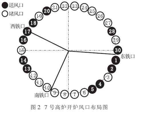 鑒于7 號(hào)高爐設(shè)備老化, 風(fēng)口二套組合磚重新澆筑,存在一定的不穩(wěn)定因素,所以本著“安全、順利、有效”的原則,此次開爐全部用直徑110 mm的風(fēng)口,風(fēng)口面積0.285 m2。采取集中堵風(fēng)口的方式,開爐風(fēng)口布局如圖2 所示。