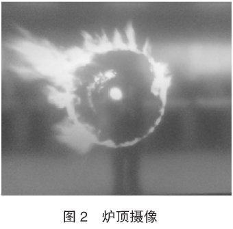 氣密箱的更換是一個系統(tǒng)的工程,準備工作、更換、調試需要時間長且不確定性較多,這次無計劃休風共持續(xù)52 h 24 min,爐內熱量損失多,并且休風前布料軌跡混亂,氣流的正常分布被破壞,休風點火后從點火孔觀察料面火焰分布(見圖1),以及爐頂攝像(見圖2),料面邊緣火苗旺盛且不均勻,中心火苗不明顯,預計爐況恢復有很大的難度。