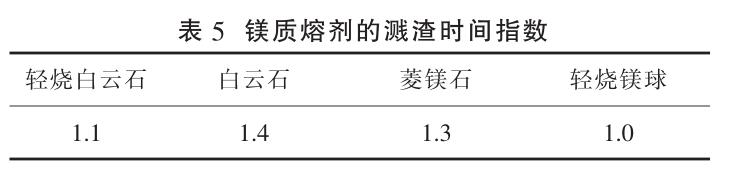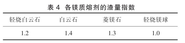 跟蹤各鎂質(zhì)熔劑冶煉爐次得出入爐總渣量,若以入爐總渣量最小的輕燒鎂球渣量為基礎(chǔ),各鎂質(zhì)熔劑的平均入爐渣量與之對比,可得出各鎂質(zhì)熔劑的渣量指數(shù),如表 4 所示。渣量指數(shù)越大,入爐總渣量消耗越高。