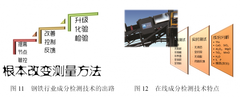 (1)在線成分檢測技術(shù)能夠在線連續(xù)檢測各種元素含量(TFe、Si、Ca、Mg、Al、Ti等全元素分析),以“在線-實時-數(shù)字化”解決了熒光和化學(xué)分析方法“離線-滯后-人工化”的弊病,適用于鋼鐵企業(yè)原料采購、混勻料場、球團車間、燒結(jié)車間、高爐車間、焦化車間、噴煤車間生產(chǎn)過程智能控制。