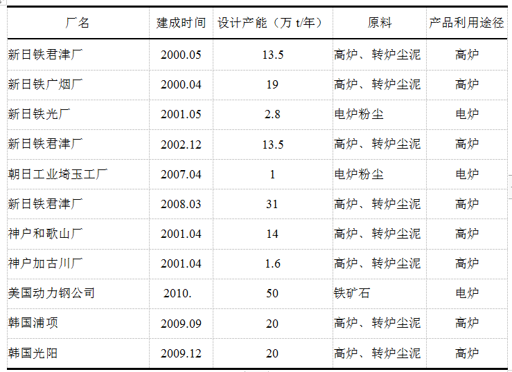日本、韓國投產(chǎn)運行的轉(zhuǎn)底爐,生產(chǎn)的金屬化球團作為高爐爐料使用,見表1。其高爐的含鐵原料主要在國際市場上購買,爐料結(jié)構(gòu)均以高堿度燒結(jié)礦為主,與我國高爐相同,值得借鑒。本文通過實驗使用粉塵生產(chǎn)預還原球團,研究其物理和冶金性能是否滿足作為高爐冶煉使用,既可以解決冶金粉塵的問題,又能有效利用產(chǎn)物,有著重要的實際意義。