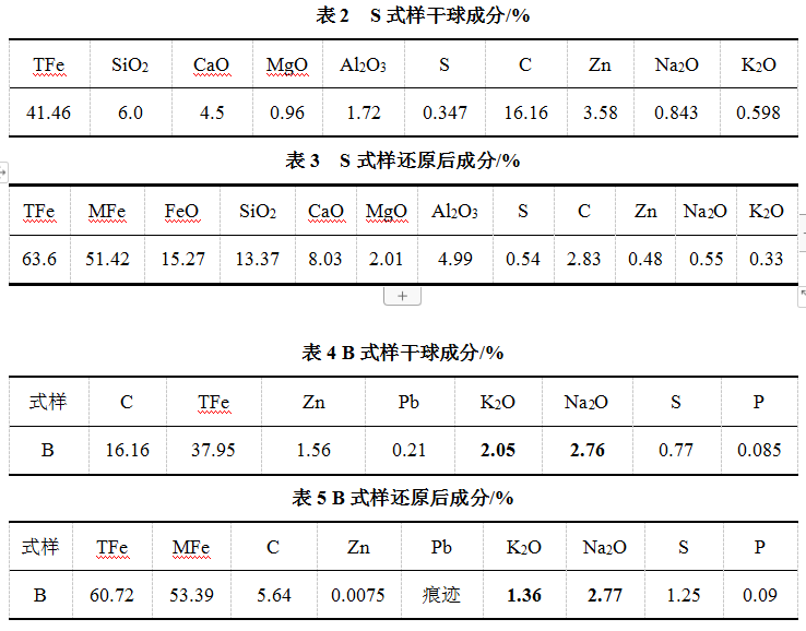 轉(zhuǎn)底爐生產(chǎn)的預還原球團成分取決于冶金粉塵和還原劑的成分,而冶金粉塵的成分與鋼鐵廠所使用的含鐵原燃料有關(guān)。兩組實驗所生產(chǎn)的預還原球團金屬化率均大于80%,表3為S廠試樣,其化學成分滿足高爐冶煉的要求。表4﹑5為B廠式樣,可以看出干球成分中K﹑Na含量很高,還原后球團中含量仍很高,達不到入爐標準。轉(zhuǎn)底爐工藝的主要用途為處理含鋅含鐵冶金塵泥,對鉛﹑鋅的脫除率很高,但是對于鉀脫除率只有50%,鈉的脫除率僅30%左右。使用堿金屬高的礦石冶煉時,堿金屬不僅在粉塵中含量高,在制備的預還原球團中仍很高,這樣的球團不易添加進高爐,但仍可作煉鋼用。
