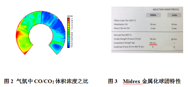 ‚預還原球團具有良好的冶金性能,無低溫還原粉化﹑無高溫還原膨脹﹑軟熔性能優(yōu)良,有利于改善綜合爐料的冶金性能,但其抗壓性能最大僅有800N,對高爐塊狀帶不利影響是限制其使用的最大因素??梢酝ㄟ^適當提高燒結(jié)礦堿度,提高燒結(jié)礦質(zhì)量,減少低溫還原粉化,強化塊狀帶爐料透氣性,以抵消預還原球團帶來的負面影響。