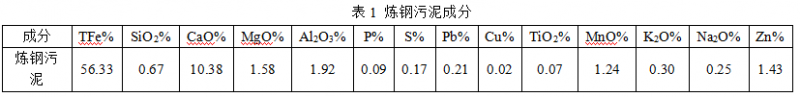 轉(zhuǎn)爐煉鋼污泥(下稱煉鋼污泥),是煙氣濕法除塵所產(chǎn)生的,轉(zhuǎn)爐年產(chǎn)生的煉鋼污泥量約10萬(wàn)噸以上,含水分25-30%,干基的煉鋼污泥TFe約50%以上,粒度200目占 90%以上,成分見表1。