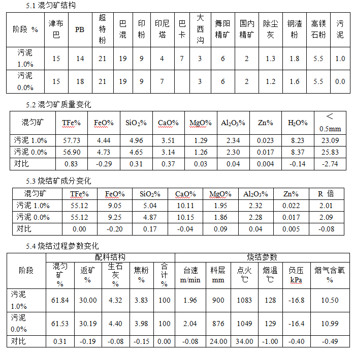 5.8.3污泥配加1.0%對(duì)混勻過程、燒結(jié)參數(shù)、燒結(jié)礦物理性能無(wú)大幅影響。