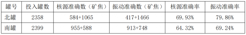 ①2014 年 10 月 7 日投入振動料空測試,截止到 2014 年 10 月 26 日 9:50 北罐共測試 2358罐,南罐共測試 2399 罐;其中北罐放礦石 813 罐;北罐放焦炭 1545 罐;南罐放礦石 1619罐;南罐放焦炭 780 罐。在 PLC 程序中實際圈數(shù)與設定圈數(shù)的差值大于0.7 時會對節(jié)流修正,因此我們認為實際圈數(shù)與設定圈數(shù)小于 0.7 時認為是準確的。對照表如下: