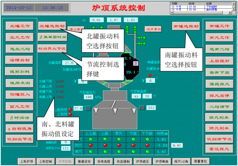 在爐頂系統(tǒng)控制畫面增加兩個振動料空選擇按鈕,一個節(jié)流控制選擇按鈕,增加放料開始和結(jié)束時振動值設定。節(jié)流控制選擇按鈕是料罐在放焦炭時選擇時間法還是料空法,時間法是指在放料達到一定時間后開大節(jié)流;料空法是指在料罐料空之后開大節(jié)流。