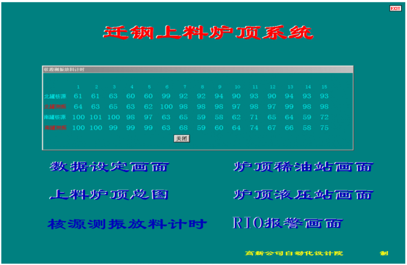 上位機程序軟件可實現(xiàn)功能:南、北料罐測振料空顯示;南、北料罐南放料時間顯示、料罐正在放料時蓬料報警;南、北料罐測振時間法料空切換畫面;南、北料罐 15 批料放料時間顯示。