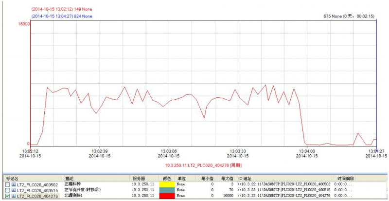 ①如下圖北罐在 11:30:41 開始放礦石,11:31:51 料罐料空;放料期間振動值最大值達到 12021,最小值達到 5181;放料時間為 68 秒。