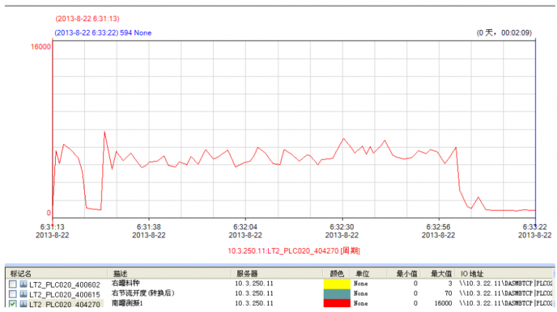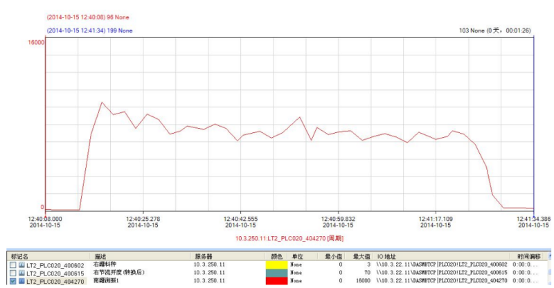 ③如下圖南罐在 11:19:47 開始放焦炭,11:21:30 料罐料空;放料期間振動值最大值達到 8950,最小值達到 4874;放料時間為 100 秒。