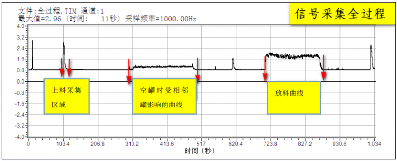 ④通過比較兩組曲線的振動值的幅值范圍及放料時間可以區(qū)分料罐內(nèi)的材料