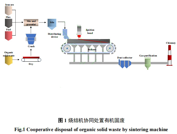 鐵礦燒結(jié)是鋼鐵生產(chǎn)過程中主要的煉鐵原料生產(chǎn)工藝,不同成分的鐵礦粉和熔劑在高溫條件下轉(zhuǎn)變?yōu)槌煞志?、性能穩(wěn)定的燒結(jié)礦。燒結(jié)工序協(xié)同處置有機固廢時對產(chǎn)品質(zhì)量的影響相對較小,并且燒結(jié)工序污染物排放受到重點監(jiān)控,具有完善的污染治理設(shè)施,可以對有機固廢處置過程的二次污染進行協(xié)同控制[8]