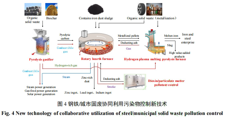 3)以轉(zhuǎn)底爐為中心的多爐窯集成低碳固廢處理新技術(shù)是處置有機固廢的有效途徑。該技術(shù)對于有機固廢具有較強的適用性,通過熱解氣化處理,將有機固廢轉(zhuǎn)化成熱解氣、熱解碳等產(chǎn)物,可為轉(zhuǎn)底爐和氫等離子體熔融熱解爐提供所需的原材料。圍繞轉(zhuǎn)底爐建設(shè)的多爐窯之間形成了完整的產(chǎn)業(yè)鏈,實現(xiàn)了高資源化利用、低污染物排放、綠色低碳冶金。