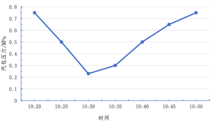 余熱回收利用系統(tǒng)的固有特性是:當(dāng)冷床暫停過鋼時(shí),熱源缺失,余熱回收系統(tǒng)開始降溫降壓;當(dāng)冷床恢復(fù)過鋼時(shí),余熱回收系統(tǒng)開始升溫升壓,恢復(fù)到暫停過鋼前的狀態(tài)。余熱回收系統(tǒng)汽包壓力隨軋線生產(chǎn)變化趨勢(shì)圖見圖 2。10:20 軋線暫停過鋼,蒸汽壓力開始下降,10:30 壓力降至 0.23 MPa,隨后軋線開始恢復(fù)過鋼,蒸汽壓力逐步上升,10:50壓力恢復(fù)至?xí)和_^鋼前的水平。由圖 2 可知,軋線暫停生產(chǎn) 10 min后再恢復(fù)生產(chǎn),余熱回收系統(tǒng)恢復(fù)到暫停過鋼前的壓力需要耗時(shí)25 min。