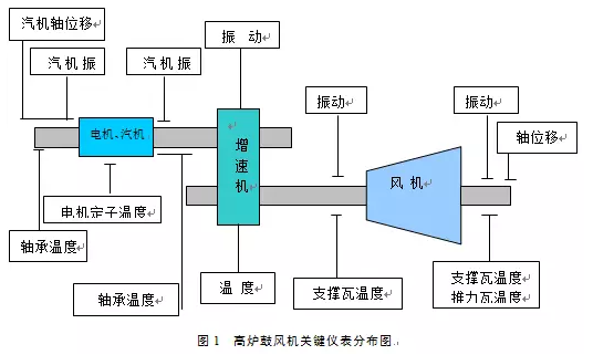 高爐鼓風(fēng)機(jī)是高速運(yùn)轉(zhuǎn)設(shè)備,需配套完善的儀表檢測(cè)系統(tǒng)以保證機(jī)組的安全運(yùn)行,包括振動(dòng)、溫度、壓力等儀表均參與了機(jī)組的聯(lián)鎖保護(hù)控制,如圖1所示為高爐鼓風(fēng)機(jī)的關(guān)鍵儀表分布圖。