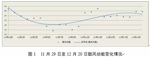 進(jìn)入12月份后,鼓風(fēng)動(dòng)能逐步回縮,至12月6日降低至波谷(31.6 kJ/s),隨后開(kāi)始漫長(zhǎng)的恢復(fù)過(guò)程,至12月21日平均鼓風(fēng)動(dòng)能逐步上升至40.1 kJ/s,爐況基本恢復(fù)正常,期間經(jīng)歷19天的恢復(fù)時(shí)間,產(chǎn)量及經(jīng)濟(jì)指標(biāo)受影響較大。