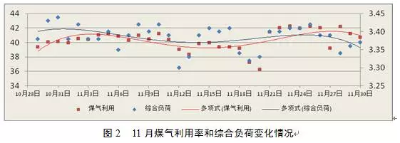 從圖2可以看出,11月末爐內(nèi)煤氣利用穩(wěn)定在40-41%左右,但是綜合負(fù)荷的控制水平卻降低至3.35倍左右,說(shuō)明操作上為了保證鐵水溫度在1470℃以上,開(kāi)始減輕綜合負(fù)荷、提高爐溫控制范圍,爐缸工作開(kāi)始變差。