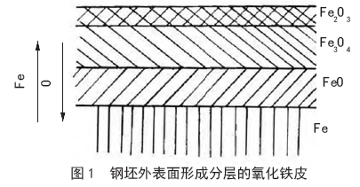氧化鐵皮的分層情況見(jiàn)圖1 所示。熱工研究結(jié)果表明,鋼坯的加熱溫度、加熱時(shí)間、爐內(nèi)氣氛等因素都對(duì)氧化鐵皮的生成具有直接影響。加熱溫度越高、加熱時(shí)間越長(zhǎng)、爐內(nèi)氣氛氧化性越強(qiáng),則鋼坯產(chǎn)生氧化燒損越嚴(yán)重[1]。