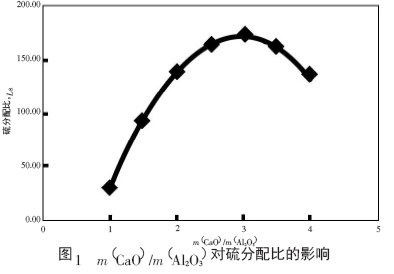 另外,m(CaO)/m(Al2O3)對熔渣硫分配比、脫硫率有影響作用。下頁圖1 為m(CaO)/m(Al2O3)對硫分配常數(shù)和脫硫率的影響[2],由圖1 可知,當(dāng)m(CaO)/m(Al2O3)>3 時,硫分配比隨著m(CaO)/m(Al2O3)的增加而降低。這主要由于隨CaO質(zhì)量的增加,熔渣黏度增加,熔渣脫硫的動力學(xué)條件變差,導(dǎo)致熔渣的脫硫效果降低,最終造成熔渣的硫分配比降低。由圖1 還可知,m(CaO)/m(Al2O3)=2.5~3 時,可以取得較高的硫分配比。