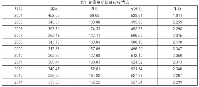 首秦一高爐2004年投產(chǎn)后指標(biāo)逐步攀升,2006年達(dá)到最好水平。首秦二高爐2006年投產(chǎn),2007年初兩座高爐出現(xiàn)大的波動(dòng),指標(biāo)急劇下滑,經(jīng)過近一年治理,2008年達(dá)到正常水平。2010年兩座高爐再次出現(xiàn)波動(dòng),2010年、2011年兩座高爐都處于不穩(wěn)定生產(chǎn)狀態(tài),高爐指標(biāo)完成較差,2011年底兩座高爐逐步進(jìn)入穩(wěn)定生產(chǎn)狀態(tài),2012年后兩座高爐受市場壓力影響,外界條件不斷變差,指標(biāo)完成不是歷年最好,但是實(shí)現(xiàn)了外界條件不斷變差情況下的長時(shí)間穩(wěn)定生產(chǎn)。