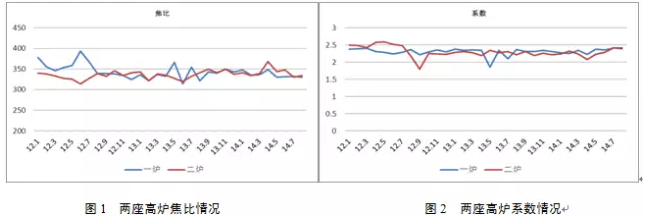 從兩座高爐2012年至2014年8月焦比、系數(shù)曲線可見,兩座高爐焦比一直比較穩(wěn)定運(yùn)行,焦比水平330Kg/t左右。兩座高爐系數(shù)保持在2.3左右運(yùn)行。2012年初一高爐處于爐況2011年失常后恢復(fù)正常后逐步加重負(fù)荷狀態(tài),一高爐2012年初焦比水平略高。焦比曲線中個(gè)別升高為高爐檢修月份。自12年開始首秦加大降低原料成本力度,因此,原料質(zhì)量比過去逐步下降,對高爐降低焦比比較不利,因此,兩座高爐焦比水平比國內(nèi)先進(jìn)水平尚有差距。系數(shù)根據(jù)公司計(jì)劃,按照市場需要控制產(chǎn)能沒有達(dá)到較高水平。