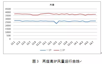 高爐全風(fēng)是高爐順行的主要標(biāo)志,高爐能否保持穩(wěn)定的全風(fēng)率是衡量高爐是否處于穩(wěn)定生產(chǎn)狀態(tài)的主要參數(shù)。從2012年至14年8月,除高爐長時(shí)間檢修外,兩座高爐月平均風(fēng)量水平保持了平穩(wěn)運(yùn)行趨勢。一高爐風(fēng)量水平在2700M3/Min左右,二高爐風(fēng)量水平在3700M3/Min左右。