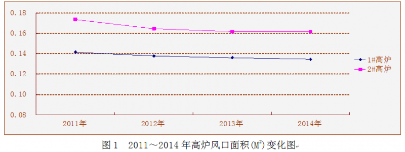 3)縮小風(fēng)口面積。在高爐送風(fēng)量不變的情況下,縮小幾個(gè)風(fēng)口的面積,各風(fēng)口速度均會(huì)增加,縮小面積的風(fēng)口風(fēng)量會(huì)明顯減少,風(fēng)量的減少會(huì)導(dǎo)致回旋區(qū)產(chǎn)生的煤氣量明顯減少,使得邊緣煤氣流減弱,從而可以抑止這些風(fēng)口附近邊緣氣流的發(fā)展,同時(shí)使其它風(fēng)口的邊緣和中心氣流都有所增加,利于改變爐內(nèi)煤氣流的分布,解決煤氣流中心邊緣“兩頭堵”的狀況,實(shí)現(xiàn)爐缸中心活躍,爐內(nèi)煤氣流合理分布,改善煤氣利用率。2011年~2014年高爐風(fēng)口面積變化如圖1所示。