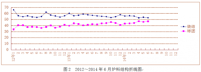 近年來(lái)隨著國(guó)內(nèi)球團(tuán)礦產(chǎn)量大幅增加,不僅中小型高爐煉鐵普遍使用球團(tuán)礦,大型高爐也加大了球團(tuán)礦的入爐比例。國(guó)內(nèi)高爐煉鐵入爐酸性氧化球團(tuán)礦比例一般為20%左右,再增加則容易出現(xiàn)高爐爐況難行,只有少數(shù)煉鐵企業(yè)達(dá)到30%以上入爐比例。而從世界先進(jìn)的高爐煉鐵爐料結(jié)構(gòu)看,增加球團(tuán)礦用量是國(guó)內(nèi)外煉鐵高爐爐料結(jié)構(gòu)發(fā)展趨勢(shì)。國(guó)內(nèi)外的理論研究和生產(chǎn)實(shí)踐表明:球團(tuán)礦作為良好的高爐爐料,具有品位高、強(qiáng)度好、易還原、粒度均勻等優(yōu)點(diǎn),酸性球團(tuán)礦與高堿度燒結(jié)礦搭配的爐料結(jié)構(gòu)較為理想[1],利于冶煉時(shí)爐內(nèi)形成合理的軟熔帶,煤氣利用好,爐況改善,適宜冶煉低硅生鐵;進(jìn)而實(shí)現(xiàn)高爐增產(chǎn)節(jié)能、提高經(jīng)濟(jì)效益。